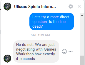 Escasa información por parte de Ulisses, y en estas últimas semanas, en su web ya ni siquiera reflejan al juego dentro de su catálogo de juegos. Apenas ha pasado un año desde que llegase este juego y ahora parece una línea ¿muerta? ¿Se lo ha tragado una tormenta de disformidad?