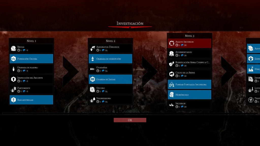 El árbol de opciones de investigación de los Drukhari, permite enfocar tu grupo de incursión de formas diferentes. Según tus elecciones de investigación, podrás recurrir más a unidades de un tipo u otro, y eso le da también cierta rejugabilidad a la facción. Podrás explorar vías diferentes y ver cómo evoluciona la cosa. Eso sí, deberás tener en cuenta que los Drukhari tienen unidades cuya supervivencia no es tan alta. Si bien pueden ser bastante letales, así que como decíamos conviene planificar bien tu forma de atacar. Montar a una unidad de infantería en una ponzoña para acercarte a un enemigo y soportar mejor el ataque de Vigilancia es algo que tiene que estar pronto en tu cabeza. A menos que quieras ver cómo pueden desbaratar tu ataque rápidamente simplemente esperando que vayas a lo loco. Además, según mejoras tu horda incursora, conseguirás bonificadores para las unidades que desembarcan de un transporte. De esta forma se sigue fomentando este estilo de juego con esta facción.