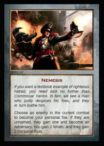 Para empezar, es un reemplazo directo de la tabla de Impactos Críticos. Cuando utilizas el mazo de Ira para los críticos, se revela la carta superior al comienzo del combate de forma que todo el mundo pueda ver cual será el siguiente crítico. Esto permite a los jugadores decidir más rápidamente si gastar ira puede ser útil obtenerlo rápidamente, o si es mejor dejar que la carta permanezca ahí amenazante durante el combate mientras todo el mundo conjetura sobre cuanto tiempo pasará antes que el crítico deba aplicarse. Como puedes ver, tambié incluye una ilustración para dar más colorido y ayudar a visualizar el propio crítico. (Nota – La Gravedad se refiere a efectos mayores que pueden alcanzarse en ciertas situaciones o gastando Gloria.)