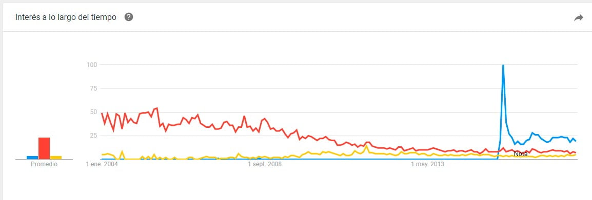 Así pues os mostraré las tres gráficas que he sacado, una incluyendo los datos desde 2004, otra que incluye los de los últimos 5 años y finalmente una vista más actual con los datos de los últimos 12 meses. En Azul se refleja el término de búsqueda «Warhammer Age of Sigmar», en rojo «Warhammer RPG» (he usado el término en ingles, porque en español apenas muestra información) y finalmente en amarillo aparecerían los datos de Cubicle 7.