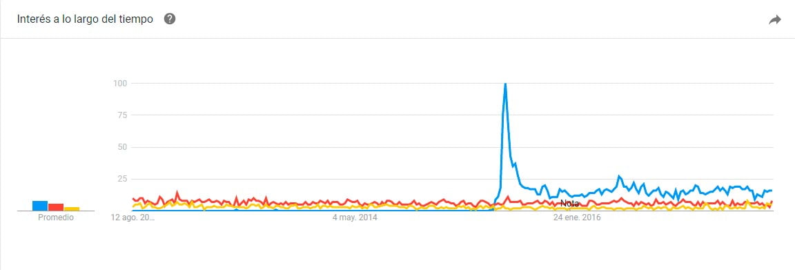 Observando la gráfica de 5 años, básicamente estamos viendo lo mismo quitando ese «último coletazo» de interés por Warhammer Rol, y teniendo en cuenta que de esos 5 años, 3 ya son desde el fin de la 3ª edición y los otros dos son vividos con esa tercera edición que tubo una aceptación reducida.