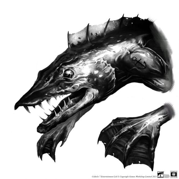 Pero no todos los monstruos de Altdorf están confinados en jaulas de hierro. A lo largo de todo la orilla este, se cuentan historias sobre el destino del pescador. Arnold Schtimmer surcó las aguas en torno a las pequeñas islas que salpican las orillas del distrito Reikerbahn. Era un hombre desagradable y mezquino del que se sospechaba que era responsable de varios pescadores. Se dice que su naturaleza depredadora pronto se reflejó en sus rasgos y se deslizó en las aguas fangosas del río donde acecha hasta el día de hoy.