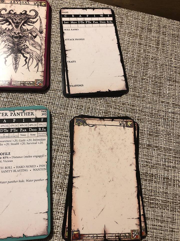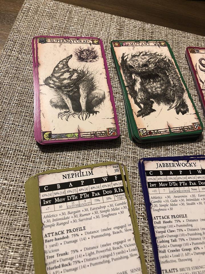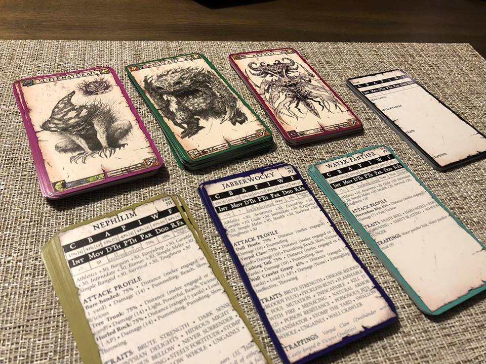 Como podréis ver en las imágenes que tenéis a continuación, tendréis unas cartasq eu por un lado os mostrarán la ilustración de la criatura y por otro lado la información relevante. Las ilustraciones van rodeadas por un marco de un color del «tipo» de criatura (humanoides, animales, bestias, mutantes, abisales,…) , de forma que las criaturas de un mismo tipo van todas con un color. Por el otro lado os encontraréis el perfil de atributos generico de ese tipo de criatura, sus rasgos, sus ataques, enseres que puedan llevar….