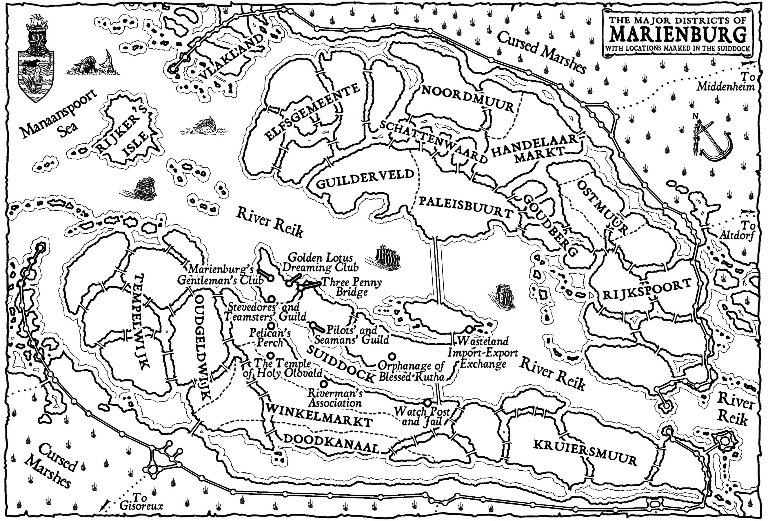 Mapa de los distritos más importantes del puerto más grande del viejo mundo. Se incluyen en el, la localización de algunos lugares destacados de la novela: Asesinato en Mariemburgo.